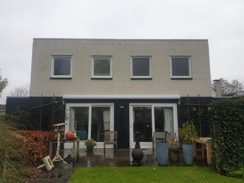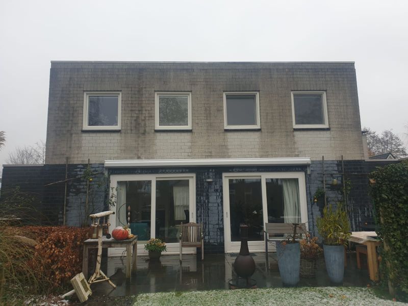 De gevels zaten hier onder de schimmels en algen. De gevels ingezet met een schimmel verwijderaar. Zoals u kunt zien ziet het er weer rood en wit uit.