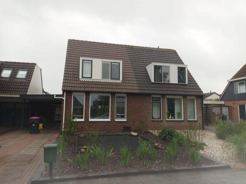 Dak en gevels. Schoongemaakt er zat niet veel mos op maar door de jaren heen gewoon vuil geworden. Je kunt zien wat een verschil.
