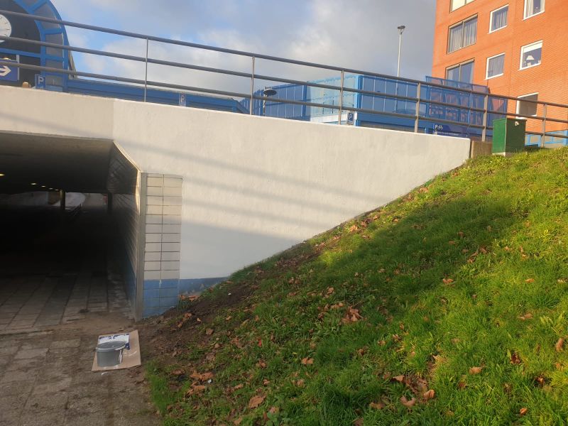 Graffiti verwijderen bij stationstunnel. Hier hebben wij eerst de ondergrond goed schoongemaakt. 70% van de graffiti verwijdert. daarna hebben wij alles netjes over geschildert. Zodat het er weer verzorgd uitziet.